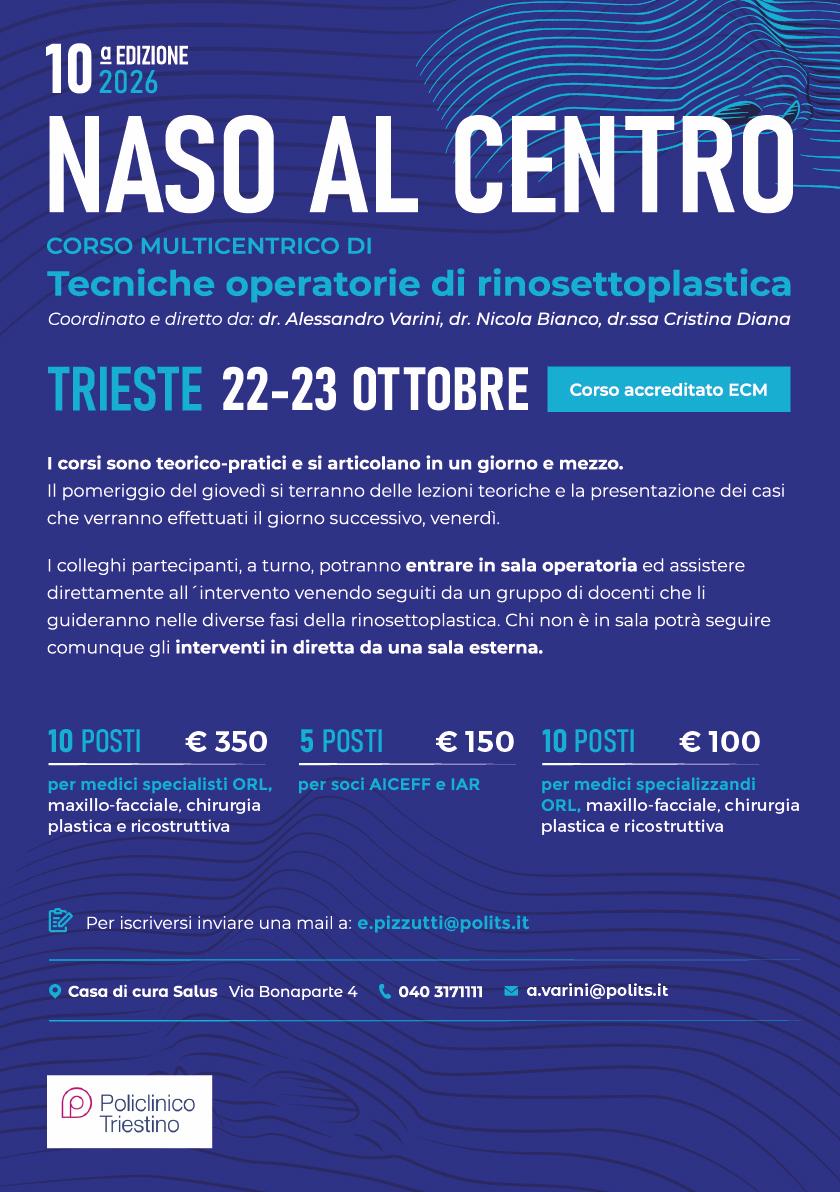 Il 22 e 23 ottobre 2026 la Casa di Cura Salus ospita la 10ª edizione di “Naso al Centro”, il corso multicentrico dedicato alle tecniche operatorie di rinosettoplastica, ormai un riferimento nell’ambito della formazione specialistica.